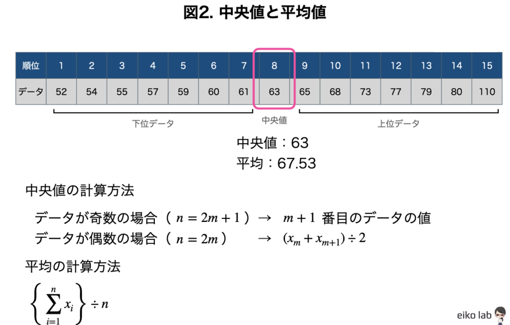データの分布の中心。その値よりも小さなデータの数と大きなデータの数が同じになる値のことです。