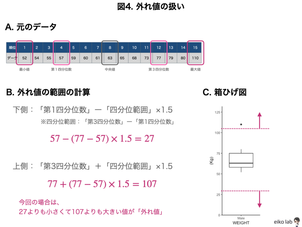 「外れ値」とされる範囲はかなりデータの中央から離れていることがわかりますね。