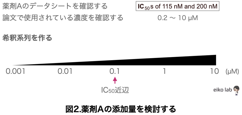 初めて使用する薬剤の場合は、薬剤のデータシートに記載されているIC50や、薬剤Aを使用している他の文献を参考にしましょう。