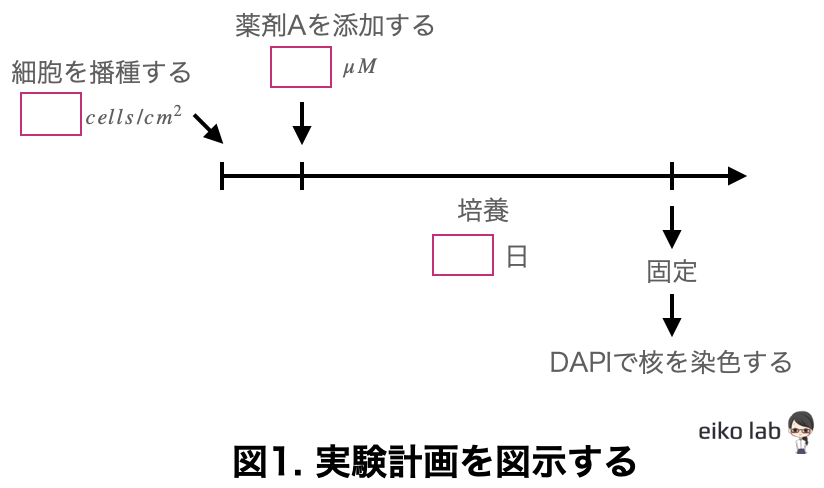どのようなプロセスを経て、「あるタイムポイントで細胞を固定してDAPIで核を染色して細胞を数える」実験を選択したのか?詳しくみていきましょう。
