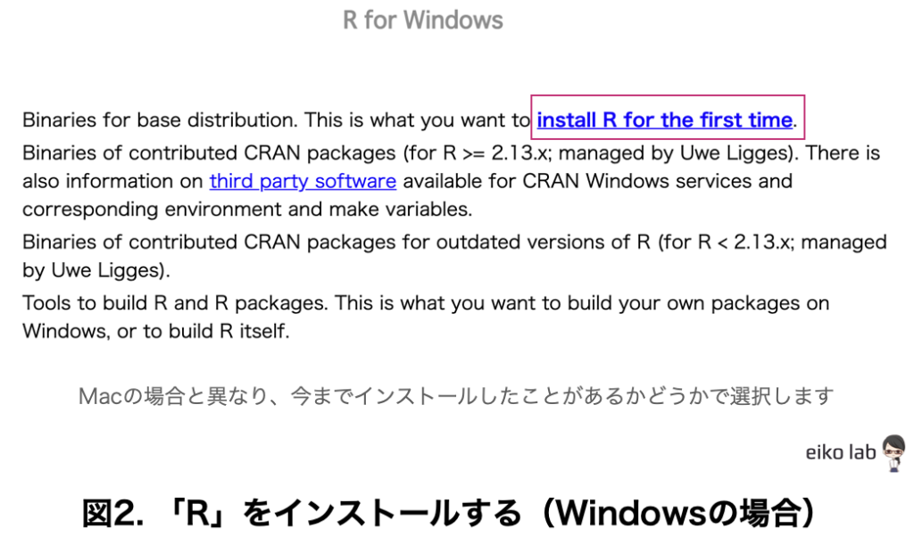 いちいちバージョンを確認しなければいけないMacと比べて、Windowsではインストールするのが初めてかどうかでインストールするRが異なります。