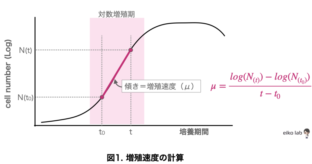 通常は、細胞の増殖が直線的(一定)になる対数増殖期の増殖速度を計算します。