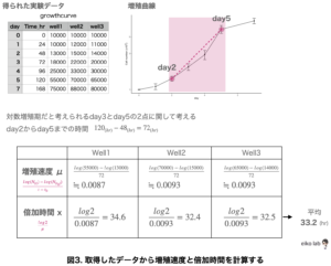 増殖速度と倍加時間を算出する計算式を表計算ソフトを使って手で計算しました。