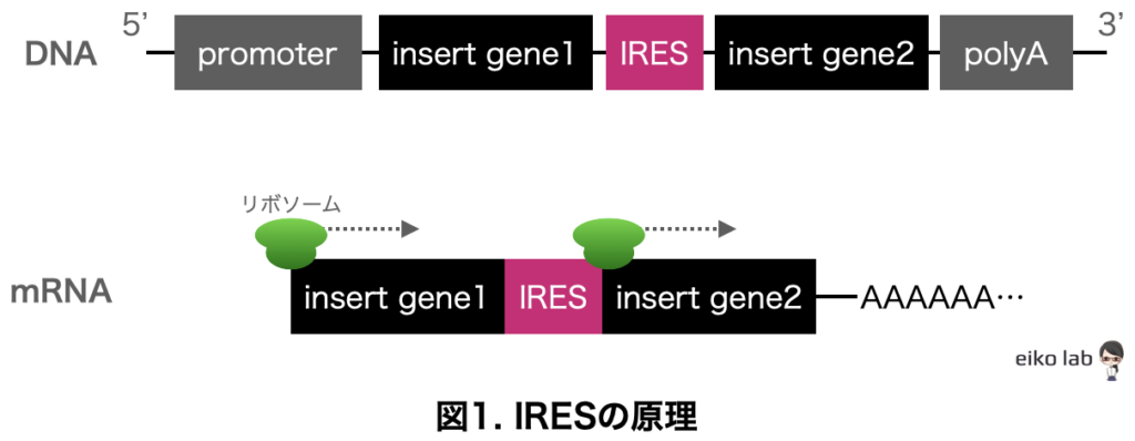 • 「IRES」とは1つの遺伝子から2種類のタンパク質を翻訳できる(主に)ウィルス由来の配列