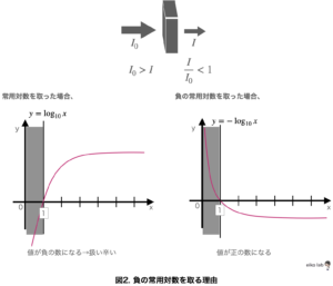 正の対数を取ると入射光と透過光の比が必ず1よりも小さくなり、値が負の数になってしまいます。