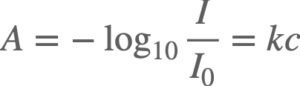 溶質の長さ(l)を一定としたときの単色光(一つの波長の光)に対する吸光度(入射光と透過光の比の対数)(A)はその物質の濃度(c mol/L)に比例する。