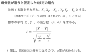 (母集団の正規性を確かめる検定がある) - 集団の等分散性が確かめられれば、スチューデントのt検定、等分散でない場合はウェルチのt検定を使う