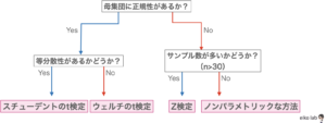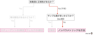 t検定を使えるかどうか?の検討方法を下のフローチャートにまとめました。