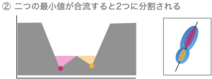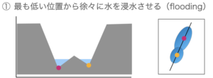 次に作った山・谷の低いところから徐々に水を浸水させて(flooding)いき、