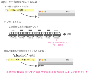 一般化するために、変数a(電車の車両)の長さを返してくれる関数".length"を使います。