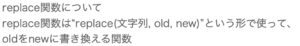 基本的な使い方は、第一引数に全体の文字列、第二引数に書き換えたい文字列、第三引数に書き換える文字列を入れます。