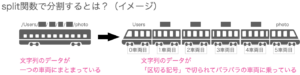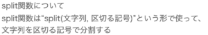 基本的な関数の形は、"split"の後に第一引数に文字列、第二引数に区切る記号を書いてきます。