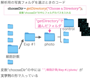 変数"chooseDir"に関数"getDirectory"を使って解析する写真が入っているフォルダのパスを入れました。