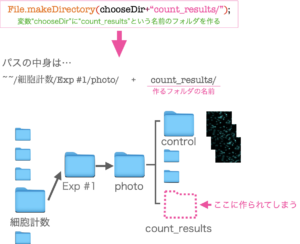 上の図のように指定して、"File.makeDirectory"の引数を"resultDir+"フォルダ名/""とすれば、簡単に一つ上の階層にフォルダを作ることができます。