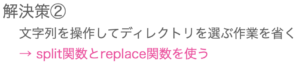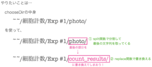 split関数を使って文字列"photo"を取り出せるようになったので、replace関数を使って"photo"の部分を新しいフォルダ名に変えていきましょう。