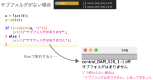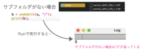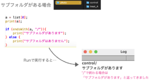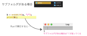 取得したファイルリストに"/"で終わるものがあれば、命令文1の「サブフォルダがあります」を、なければ「サブフォルダがありません」とLog画面に表示されるようにします。