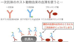 一次抗体ホストの血清を使うと、二次抗体が血清に含まれている別の抗体を認識して結合してしまうため、どれが抗原A由来のシグナルかわからなくなってしまいます。