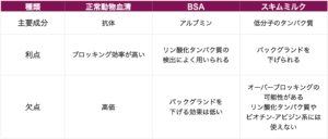 一般的にブロッキングに使う試薬は大きく分けて3つあります。