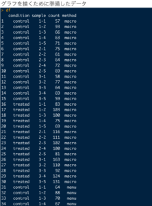 前回の『RStudioを使う#9』で描いたドットプロットを書くために準備したデータフレームがこちら。