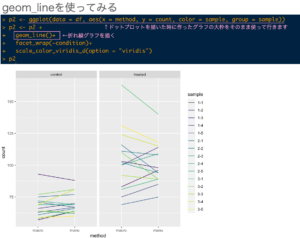 前回の記事で描いたドットプロットのコードに先程書いた"geom_line"を"+"でつないでいくだけです。