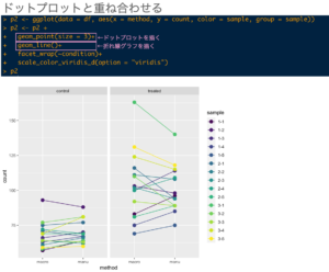 第十弾の今回は、"tidyverse"パッケージの"ggplot2"を使って対応するドットプロットを結んでいきます。