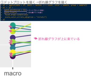 先にドットプロットのコードを書いてから折れ線グラフのコードを書いているので、折れ線グラフが上に重なり合っている状態です。