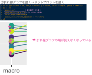 - 今回のコードの順番は折れ線グラフ→ドットプロットの方がキレイなグラフが描けました